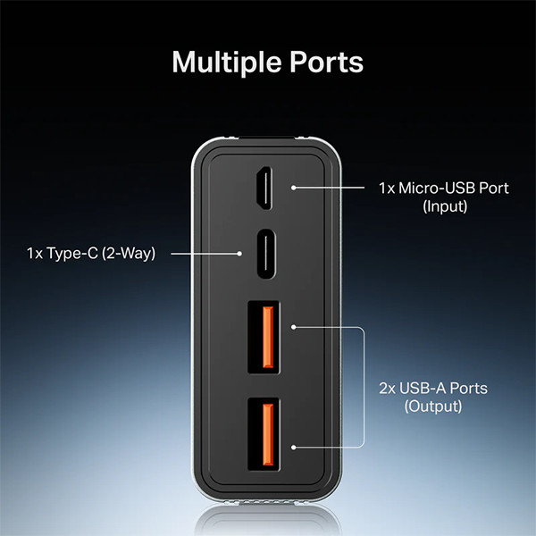 • Multiple ports: 2 × USB-A Outputs + 1 × USB-C + 1 × Micro USB (input) → Can Charge Several Devices at once.