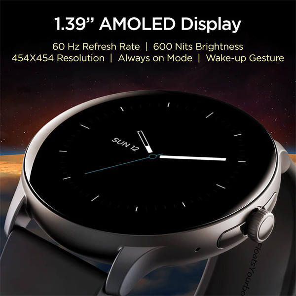 - Display: 1.39″ (≈ 3.53 cm) AMOLED panel. Resolution stated as 454×454 pixels in multiple specs.