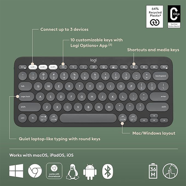 • A Design Choice You’ll Feel Good About: Plastic parts in the Pebble Keys 2 K380s Slim Keyboard include minimum 49% certified post-consumer recycled plastic (1)