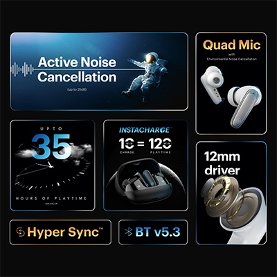 • Playback Time: Up to ~ 35 hours total (earbuds + charging case) when ANC is off