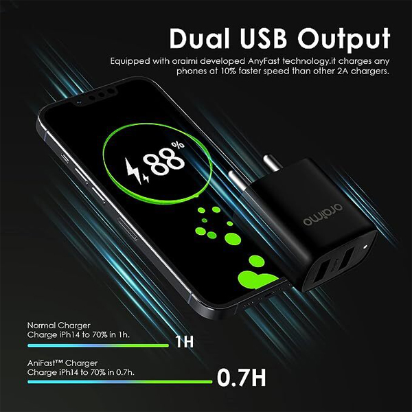 • Dual Port USB Wall Charger Adapter】Oraimo USB Charger with dual ports allow you to charge 2 devices at the same time with the total output of 2.4A current. Single port allows Max 2.4A current when connecting only one device. Much more convenient and save your time effectively.