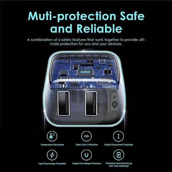 • Safe Charging】With the intelligent chip inside, dual USB wall charger matches the current as your device’s need automatically. Over-current, over-voltage and short-circuit protection also effectively protect your smartphones from damage