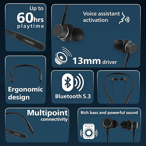 - Upto 60 Hours Playtime: Long battery life lets you listen all day without frequent charging .