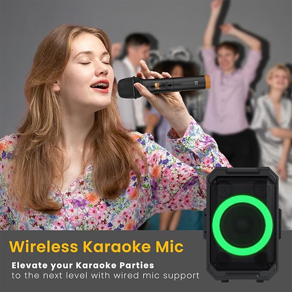 • Wireless karaoke mic with speaker : Sing your heart out without wires with this karaoke speaker with a mic system! Included wireless UHF microphone lets you move freely around the party and party hard.
