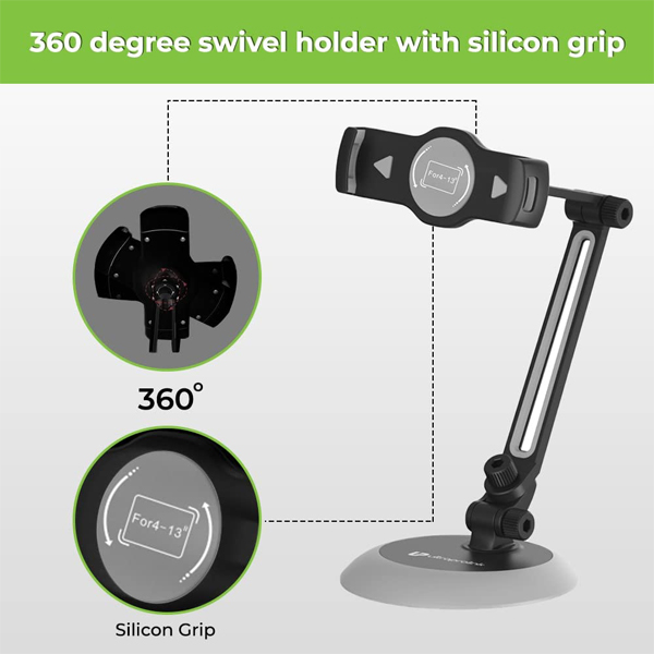 • 360 degree Swivel Holder with silicon grip for horizontal or vertical orientation – Jeeves is made up 360 degree Swivel Holder with silicon grip that allows a device to be mounted with stability and conveniently. Both vertical and horizontal orientation Jeeves is a must-have tablet stand for home entertainment, shop showcasing, office display & online classes. Perfect hands-free convenience for seniors at home making video calls to distant loved ones.