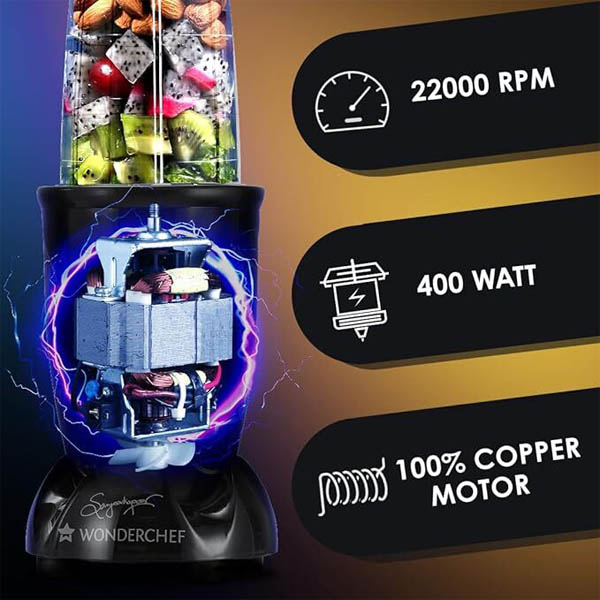 - Powerful 100% Full Copper Motor: The compact yet powerful machine grinds the toughest of chutneys and masalas, and ensures nutrition extraction from all fruits and veggies thanks to its incredibly high speed of 22,000 RPM, which is almost twice that of normal mixer-grinders