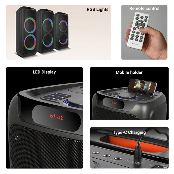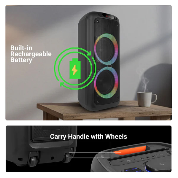 • Portability & Convenience: Built-in rechargeable battery gives up to ~5 hours of backup on moderate volume (LEDs off). Type-C charging port for modern, convenient charging, Carry handle and wheels make it easier to move around- perfect for portable party setups. Mobile holder lets you mount a phone or tablet right on the speaker for video/DJ use