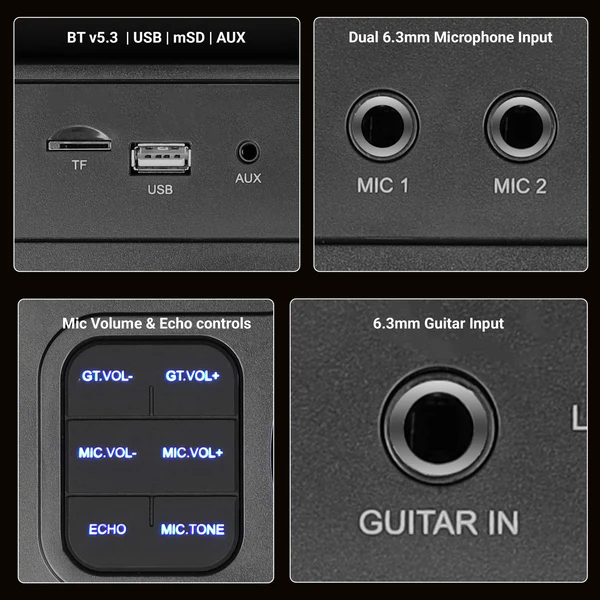 • Karaoke & Live Performance Features: Dual wireless microphones (voice-changing) included- great for karaoke fun. Dual 6.3 mm mic inputs allow you to connect wired mics too. 6.3 mm guitar input means you can plug in instruments for live performance or practice.  Mic volume and echo controls let you fine-tune vocal effects during use